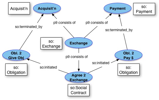 In the attached diagram, there is the simple case of paying for something. The new class so:Exchange is an Activity that encapsulates the provisioning activities and the agreement to make the exchange. Its duration is the entire duration of the fulfillment of the obligations. It might, therefore, include many such provisions – such as paying monthly installments as separate payments.