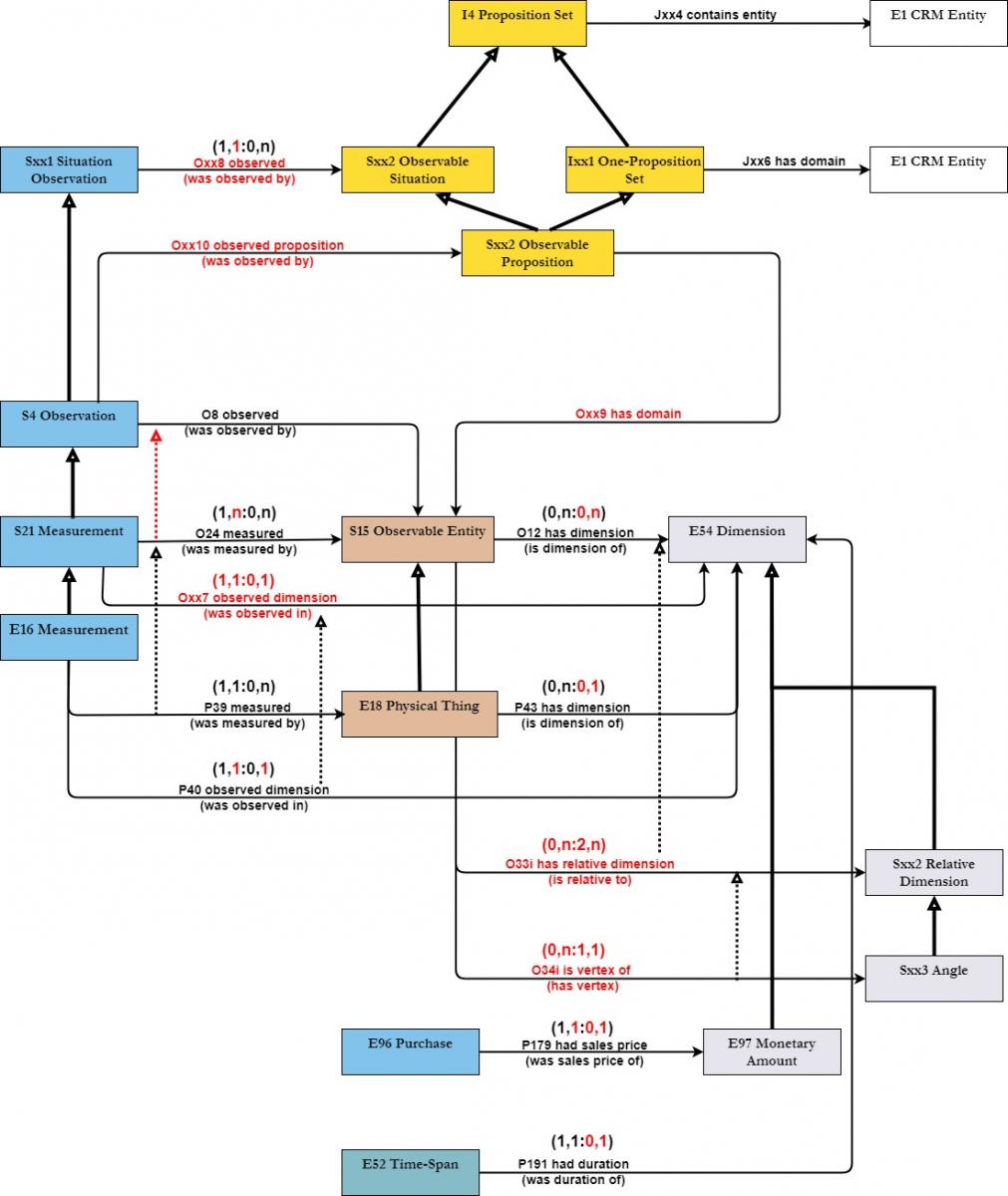 The model for dimensions has been extended to measure instances of E5 Event and S15 Observable Entity (not only instances of E18 Physical Things). Which worked fine until the modeling of relative dimensions, which pertain to the combination of two things, was implemented.