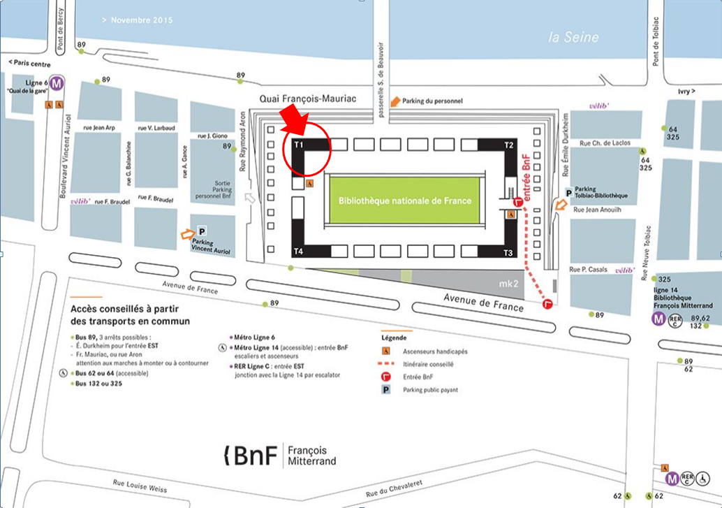 Entrance will be in Tower 1 (T1), at the junction of quai François Mauriac and rue Raymon Aron (see map attached). As access to the room is limited to staff only, you will have to be accompanied by people from the Metadata Department, who will be at the front desk each day from 9.15 to lead you to the meeting room.