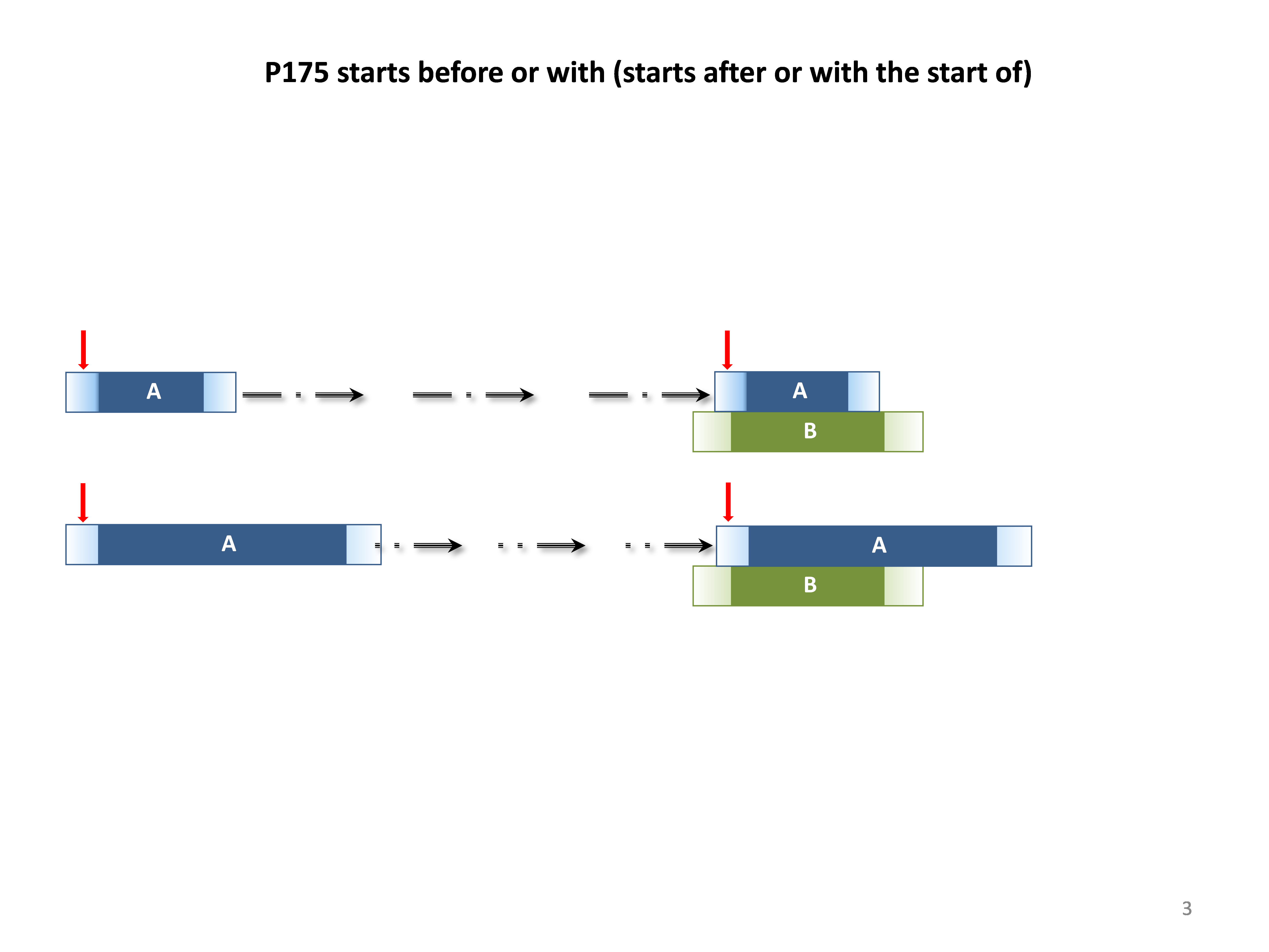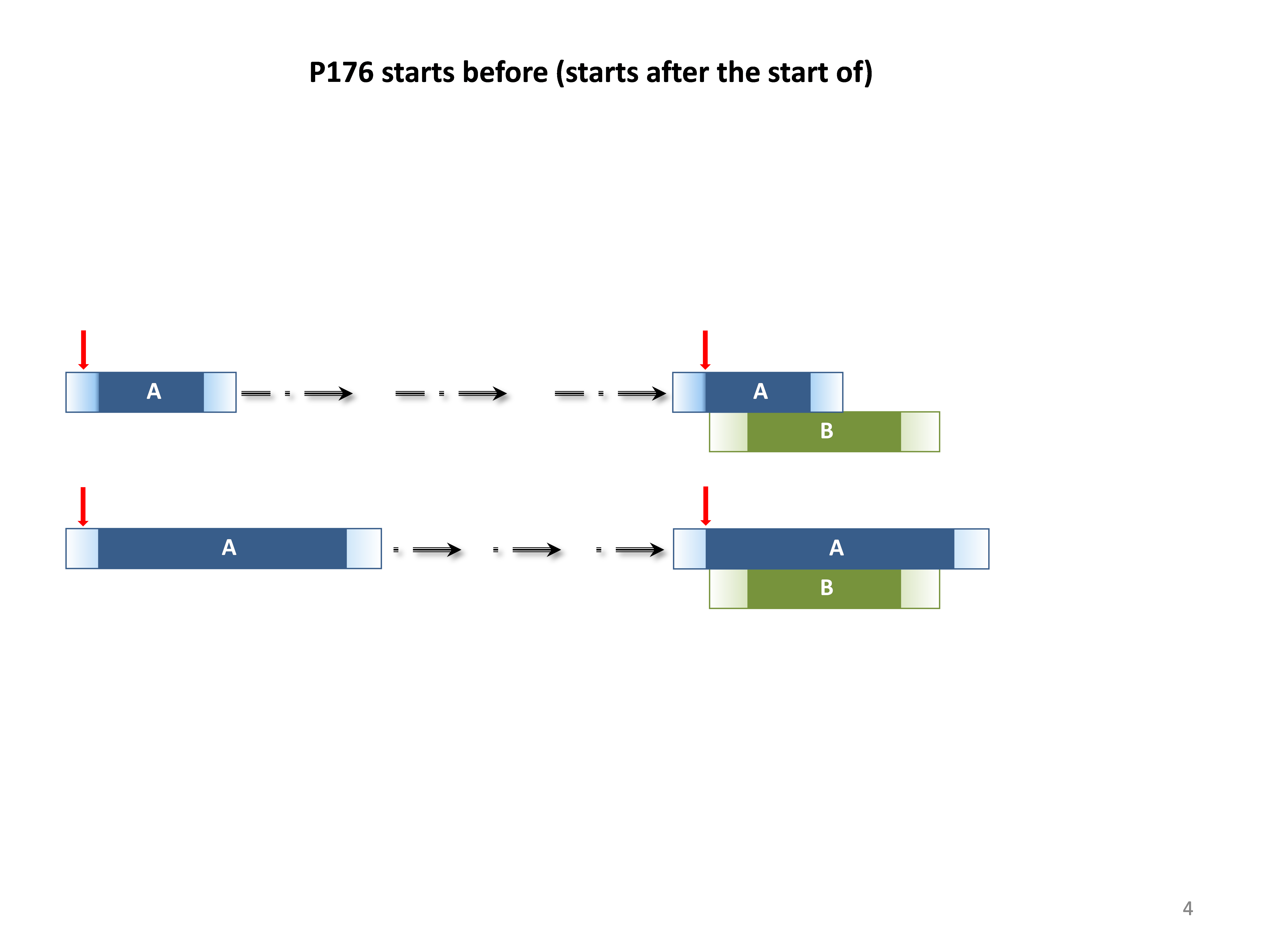 This property specifies that the temporal extent of the domain instance A of E2 Temporal Entity starts definitely before the start of the temporal extent of the range instance B of E2 Temporal Entity. In other words, if A = [Astart, Aend] and B = [Bstart, Bend], we mean Astart < Bstart is true. This property is part of the set of temporal primitives P173 – P176, P182 – P185. This property corresponds to a disjunction (logical OR) of the following Allen temporal relations [Allen, 1983]: {before, meets, overlaps, contains, finished-by}